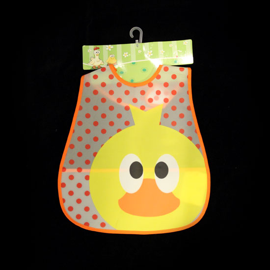 This adorable baby bib is printed with allover polka dots and a lovely duck pattern. The self-adhesive straps allow you to put the bib around your baby's neck with ease. This baby bib helps minimize stains from food on babies' clothing.