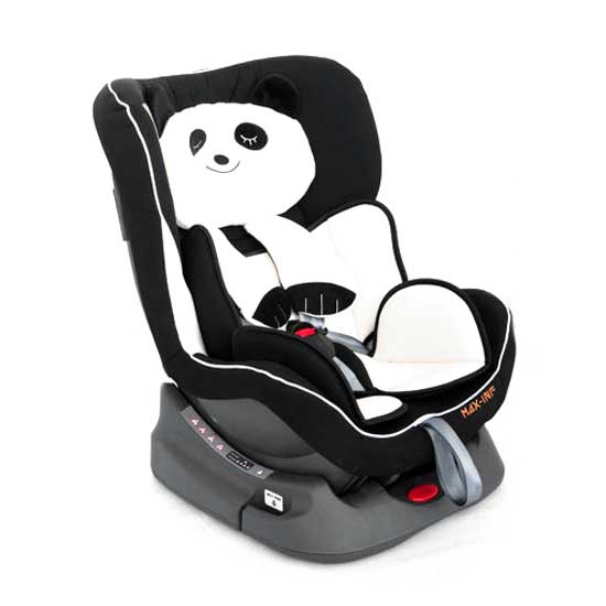 This baby car seat in black and white features a panda-like pattern for cuteness. It comes with a 3-point seat belt for maximum safety. The deep and wide side wings guarantee added side and head impact protection.