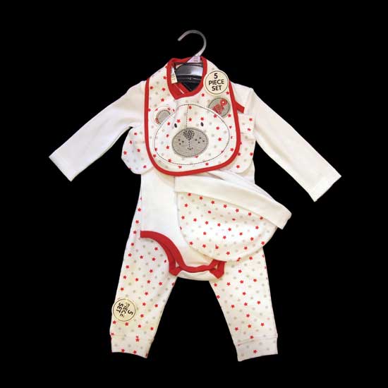 This is a 5-piece baby clothes set in pure cotton for a soft and comfy touch. The clothing set features a bib, a beanie, an onesie, a romper and a pair of baby mittens. The star patterns add a lovely accent to the baby clothing set.