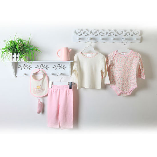 This is a baby wear set that is designed for baby girls. It comes with a baby romper, a T-shirt, a pair of trousers and a bib. Each piece is made of top-grade material for a soft and comfortable texture.
