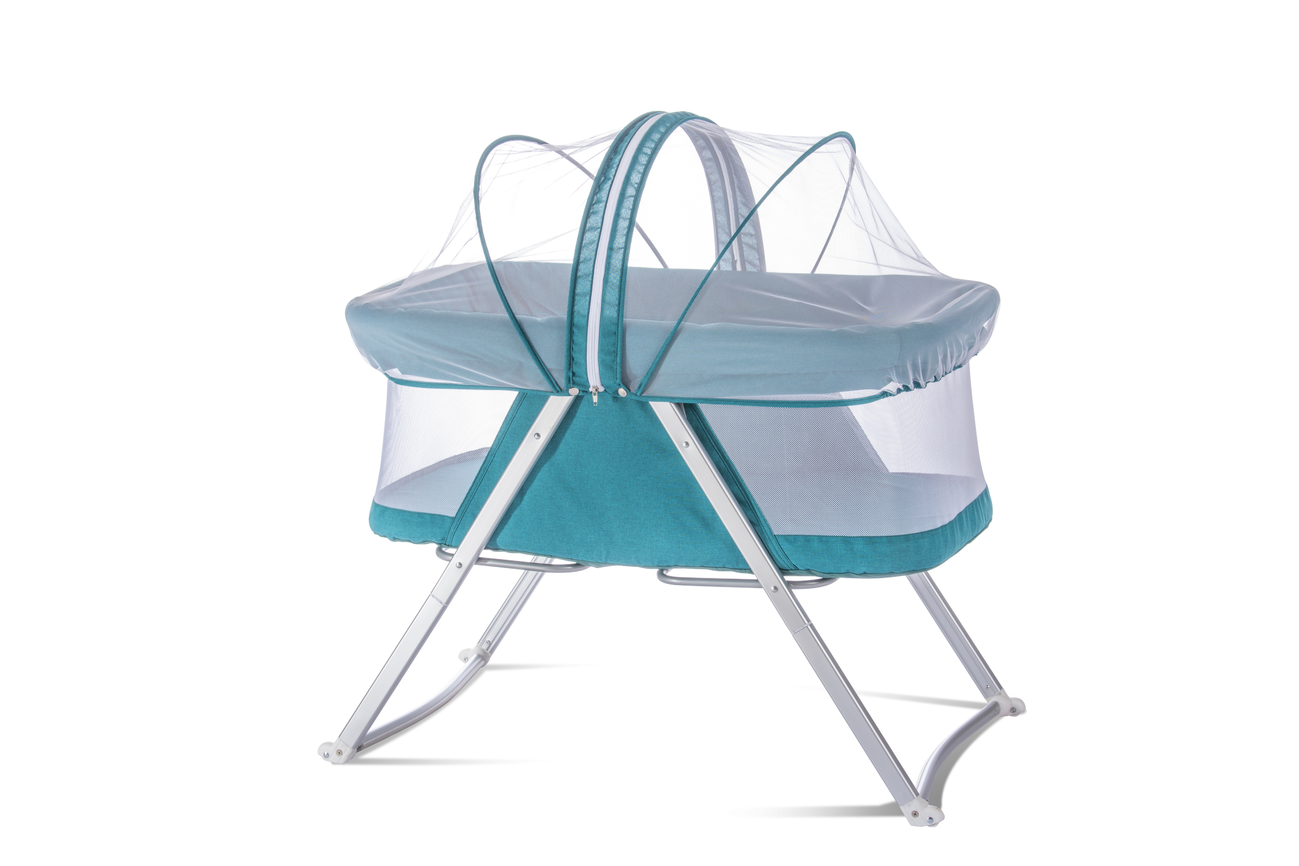 This baby cradle has an aluminum frame and is suitable for babies aged 0-6 months. It offers rocking function and has a removable mosquito net. The baby cradle has wheels for convenient movement and can be easily folded with one hand.