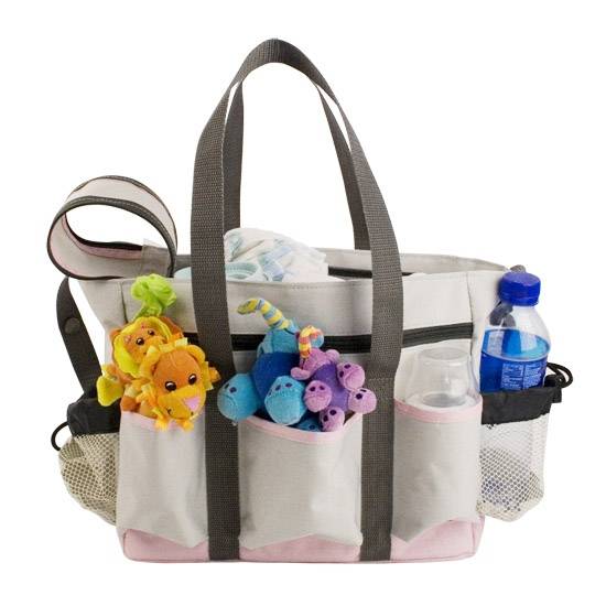 This is a useful baby diaper bag designed with compartments for holding different items in place. Three exterior open pockets are perfect for wipes, bibs, toys and more. The large inner compartment with zip closure is for diapers. The elasticized pockets on the side are easy to reach and suitable for baby feeding bottles.