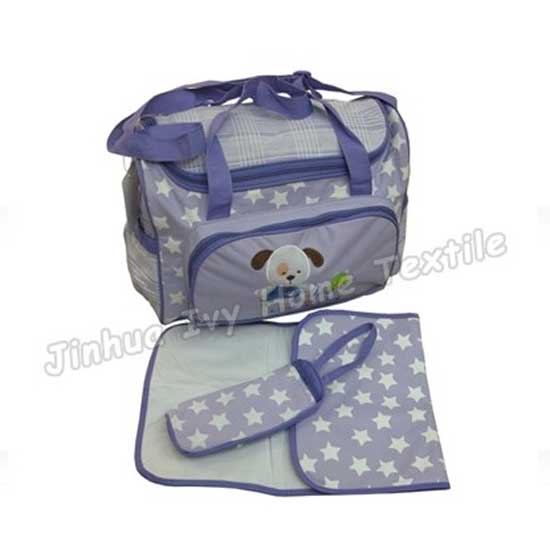 This baby diaper bag comes in blue with a beautiful white star pattern. The lovely dog print on the front lends extra style. The roomy bag is designed with several compartments for storing baby supplies such as diapers and milk bottles.