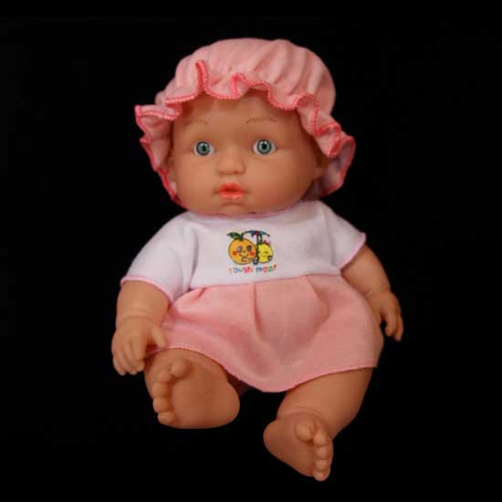 This baby doll is dressed in a white and pink short-sleeved dress with a lovely print on the bodice. Its big eyes and pouting mouth add irresistible cuteness. Instill your kid with a sense of responsibility of taking care of others with this adorable doll.
