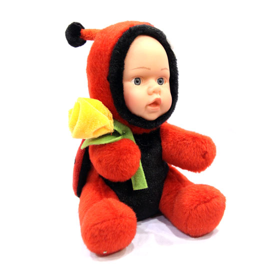 The baby doll is beautifully dressed in hooded wear embracing a yellow rose. The baby doll showcases adorable and cuddly appearance. The lovely baby doll is surely an exciting toy for any child.
