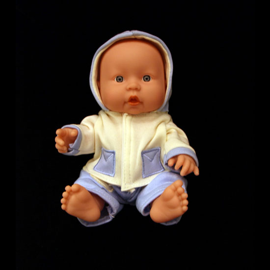 This chubby, adorable baby doll is made out of quality vinyl. It is crafted with an innocent face and a lifelike posture. The doll also wears well-designed clothes with a hood.
