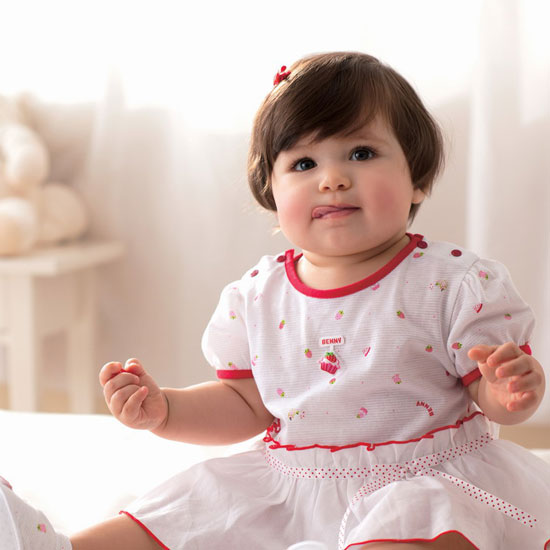 This pictured little fancy dress is made especially for the young baby girls. The ruffled bottom and the lovely cake patterns bring a sweet touch of style. Dress your little baby girl pretty in the summer with this short-sleeve dress.