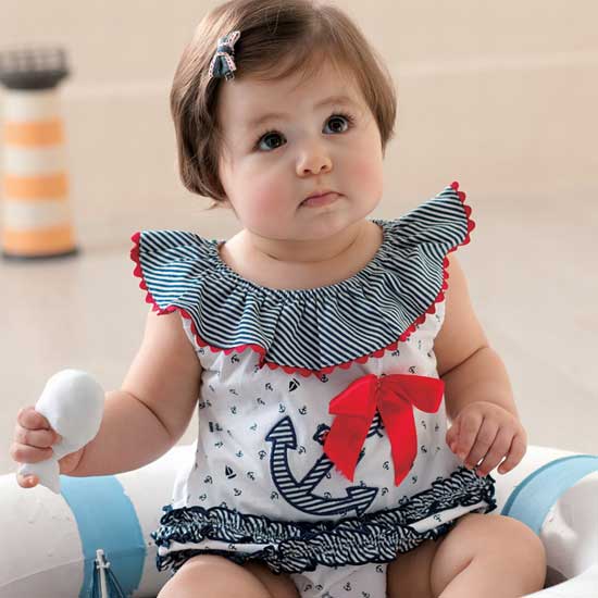 This babies' dress features beautiful striped pleats with red trimming. A bold red ribbon bow decorates this outfit. Marine-style elements lend extra sweetness to the wearer.