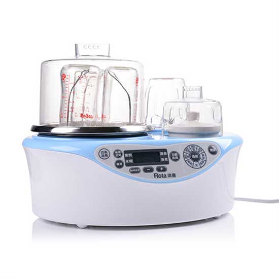 Displayed is a baby food cooking machine with multiple functions. With a safe 600W power, this machine can steam disinfect food and warm milk for your baby. This baby food cooking machine is made professionally for a long service life.