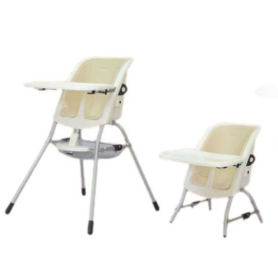 Photographed is a high chair designed for young children to have their meals easily. The padded seat and the appropriately-positioned tray offer enhanced comfort and convenience. The high chair is available in a stackable or stand-alone design.