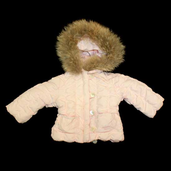 The babies' down-filled jacket shows a chic style. The fluffy fur details around the hood offers added warmth. The baby jacket makes a great choice for your beloved little one in winter.