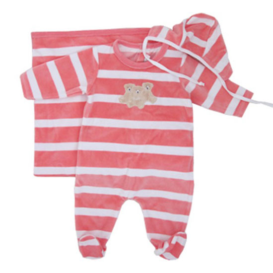This is a baby jumpsuit set that includes a jumpsuit, a bib and a blanket. The two-toned striped patterns add a touch of elegance to the whole piece. This baby wear set is an ideal addition to complete your little one’s wardrobe.