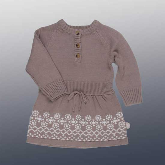 This baby knitted dress is made of high-quality yarn that guarantees perfect comfort. The round collar and the round button detail on the front are simplistic and charming. The tied bow at the waist and the white floral patterns along the hem look girlish and sleek.