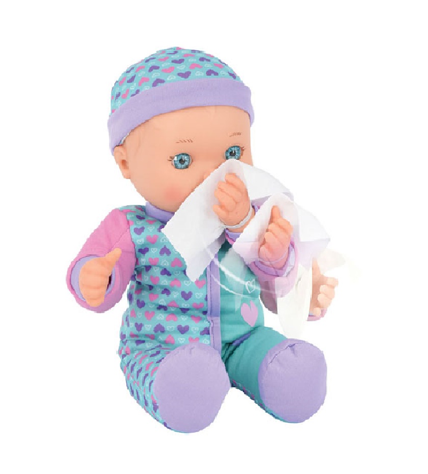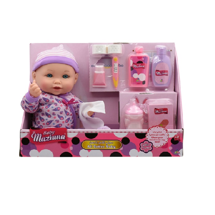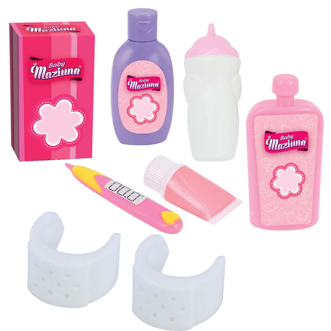 Oh no,,,,Baby Maziuna has a cold, poor thing! Achooo, you can even hear her sneeze! Your little one can take care of her and make her all better with a play thermometer, baby bottle, play lotion and other accessories.