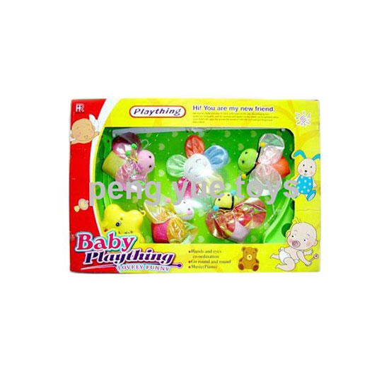 This baby mobile toy features hanging decorations in various shapes. The well-designed toy can also produce music. The well-manufactured toy is safe for babies.
