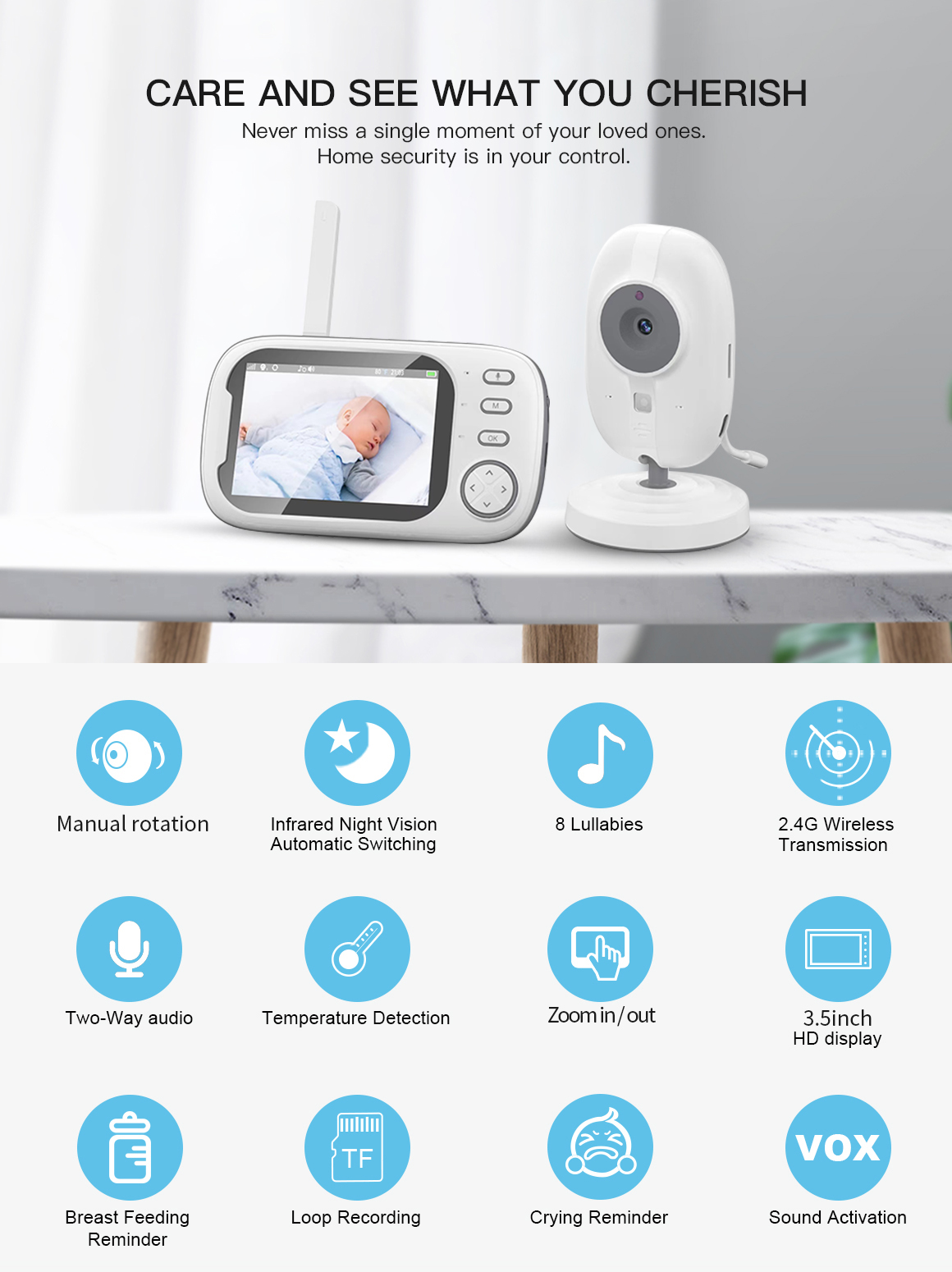New 720P 3.5Inch Screen Video Recording Baby Monitor Temperature Cry Sound Detection Two Way Talk 2.4G wireless Baby Phone Camera Baby Monitor