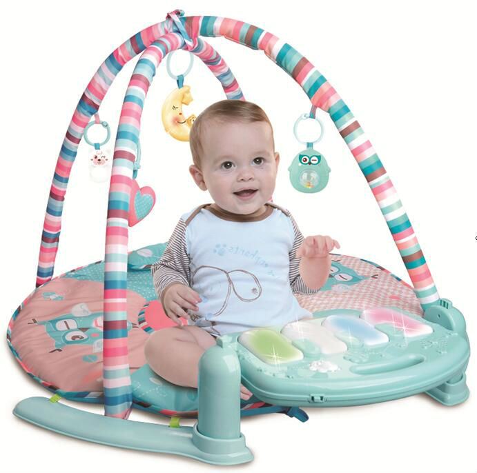 Showcased is a soft and comfortable padded playmat ready to entertain your little one. This 2-in-1 play gym is hanging with 4 soft toys on the intersecting arches and equipped with a lifting piano in the front, which stimulates your baby’s motion sense, develops its fine motor skills and introduces different sounds through fun play. Finished in soothing pale tones, the play gym flaunts an adorable appearance with prints in dots and stripes.