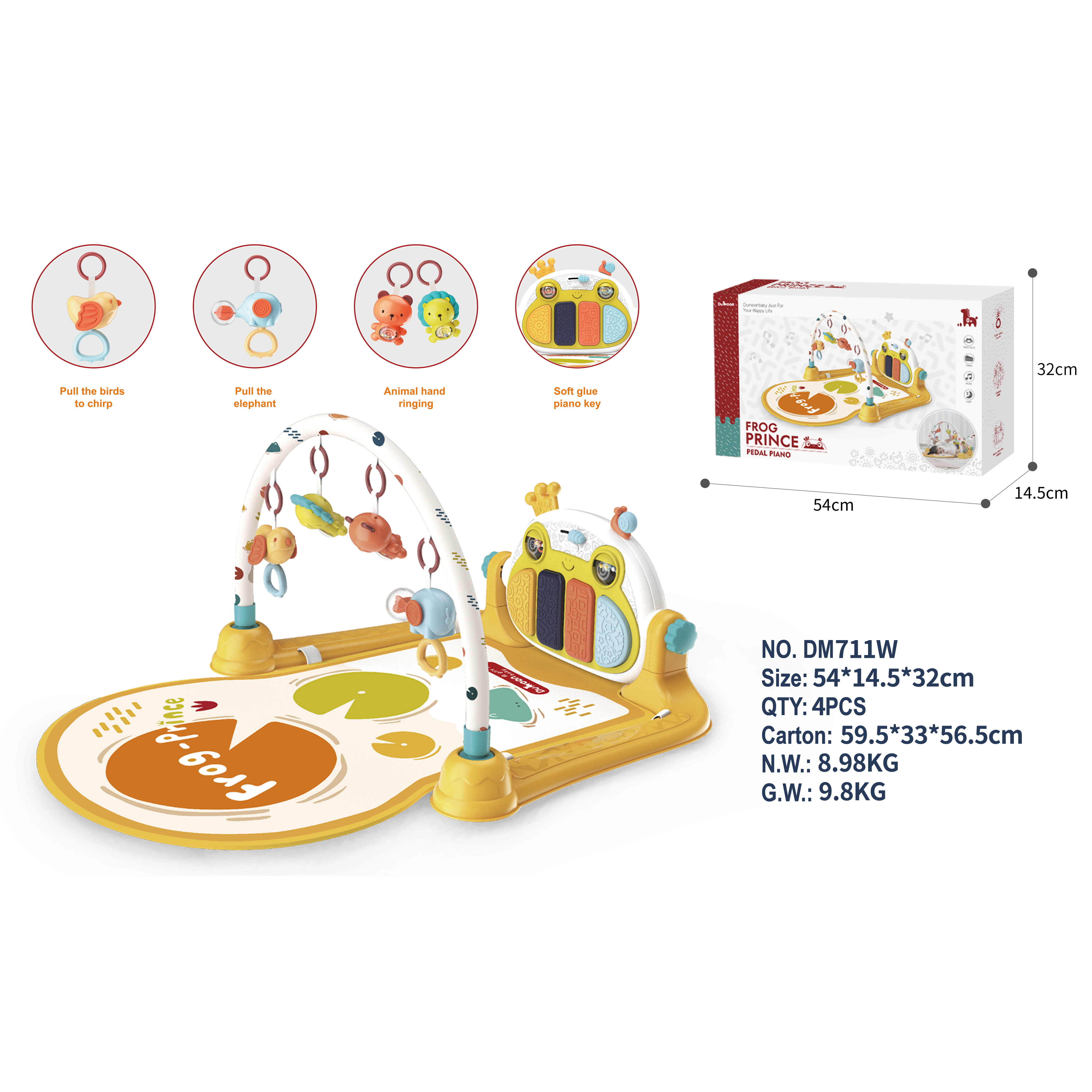 Features: Soft glue pedal piano, toy bar with various animal-shaped toys.