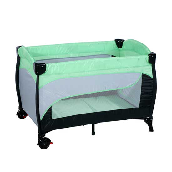 This baby playpen comes in black, light gray and pastel green with a peaceful touch. It features a novel net design that promises enhanced safety and coziness. It is also designed with two big wheels, curved short rails, curved legs and a zipper entrance.