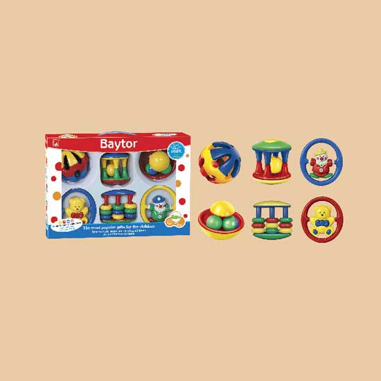 Displayed is a baby rattle set that comes with six pieces of different designs. Each piece features multiple colors and make crispy sounds to entertain your baby. This baby rattle set is made of high quality materials for durability.