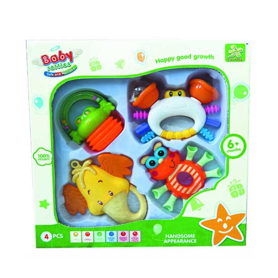 Displayed is a baby rattle set that comes with four pieces in a window box. Designed with care, these colorful baby rattles feature different fun cartoon figures, including a crab and an elephant. This lovely baby rattle set is made of high quality materials for a safe use.