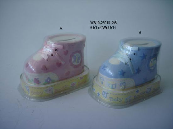 This gorgeous saving bank features a pink baby shoe design. It boasts allover heart patterns and a ribbon shoelace for extra cuteness. This adorable yet functional saving bank makes a great gift idea.