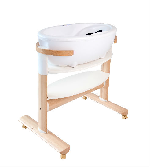 The bath tub stand is height-adjustable to 3 different levels for individual adaptation to the height of the parents.