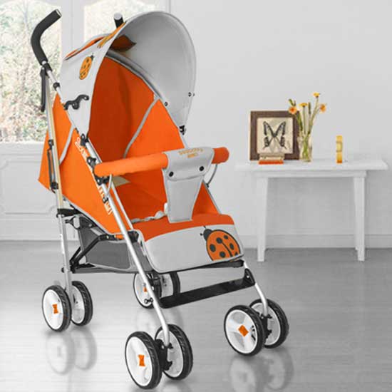 This attractive baby stroller comes with a sharp color combination of orange and gray. Beautiful ladybird patterns decorate this baby stroller. Its durable construction makes it an ideal choice for you.
