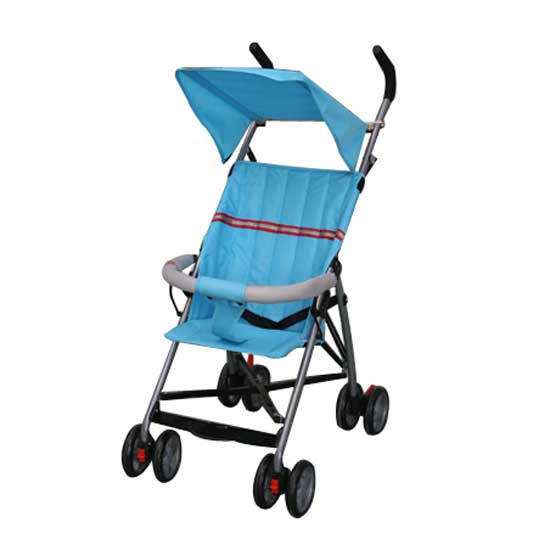This blue baby stroller is designed with a folding canopy and a front safety rail. The four wheels with brake permit easy, flexible movements. The durable construction ensures reliable performance.