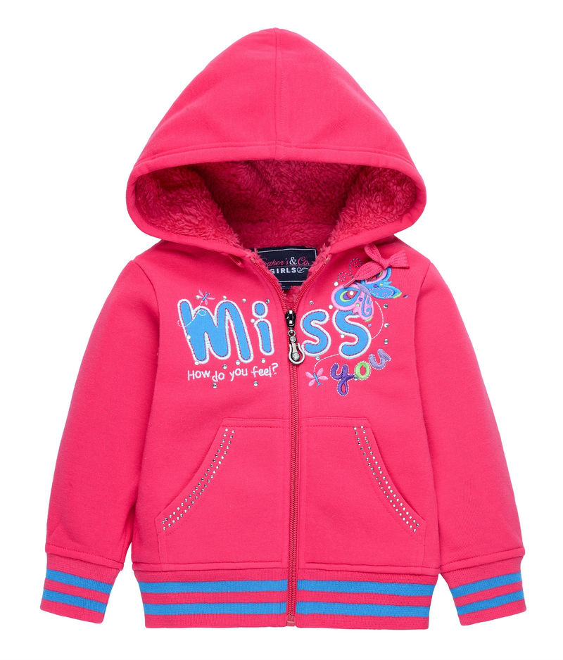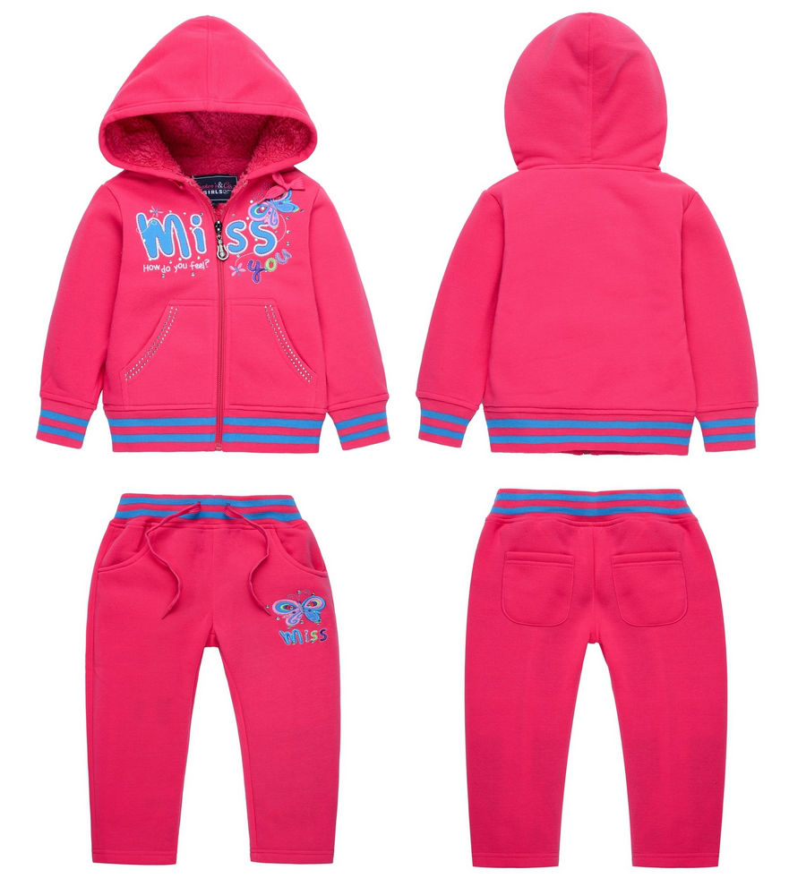 Great tracksuit with embroidery details is for girls. Soft material, thanks to inner coral fleece makes it easy to wear, as well as cute embroidery at the front of the top and pant, striped ribbed cuffs, waist and hemline. Comfortable for doing sports as well as casual