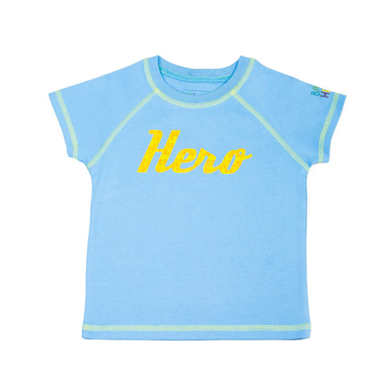 This baby T-shirt features a blue finish with the word "Hero" in yellow printed on top. Made of 200 GSM organic cotton, this baby T-shirt is easy to wash and comfortable. It is perfect to wear in summer and spring.
