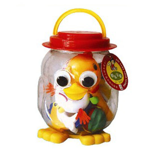 This baby toy set features a cute transparent penguin-shaped jar. Assorted toys are provided for added entertainment. The cap of the jar is nicely designed as a red hat for the penguin.