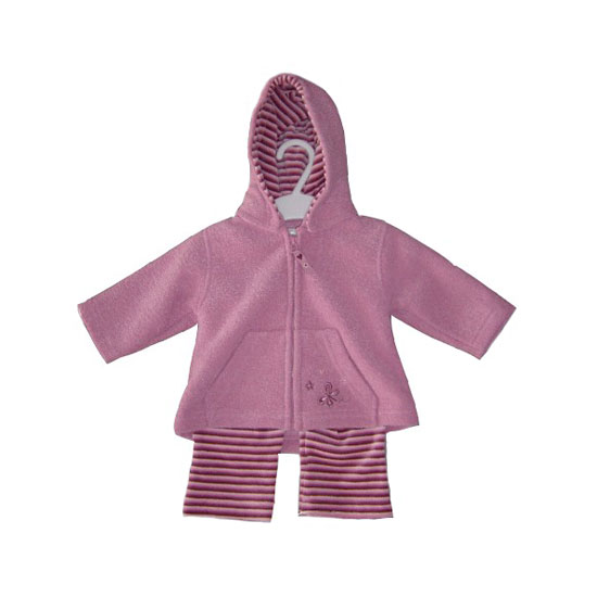 This baby wear set includes a jacket and a pair of trousers. The jacket features long sleeves, a zip front closure, a hood and two waist pockets. The trousers are printed with stripe patterns for added style.
