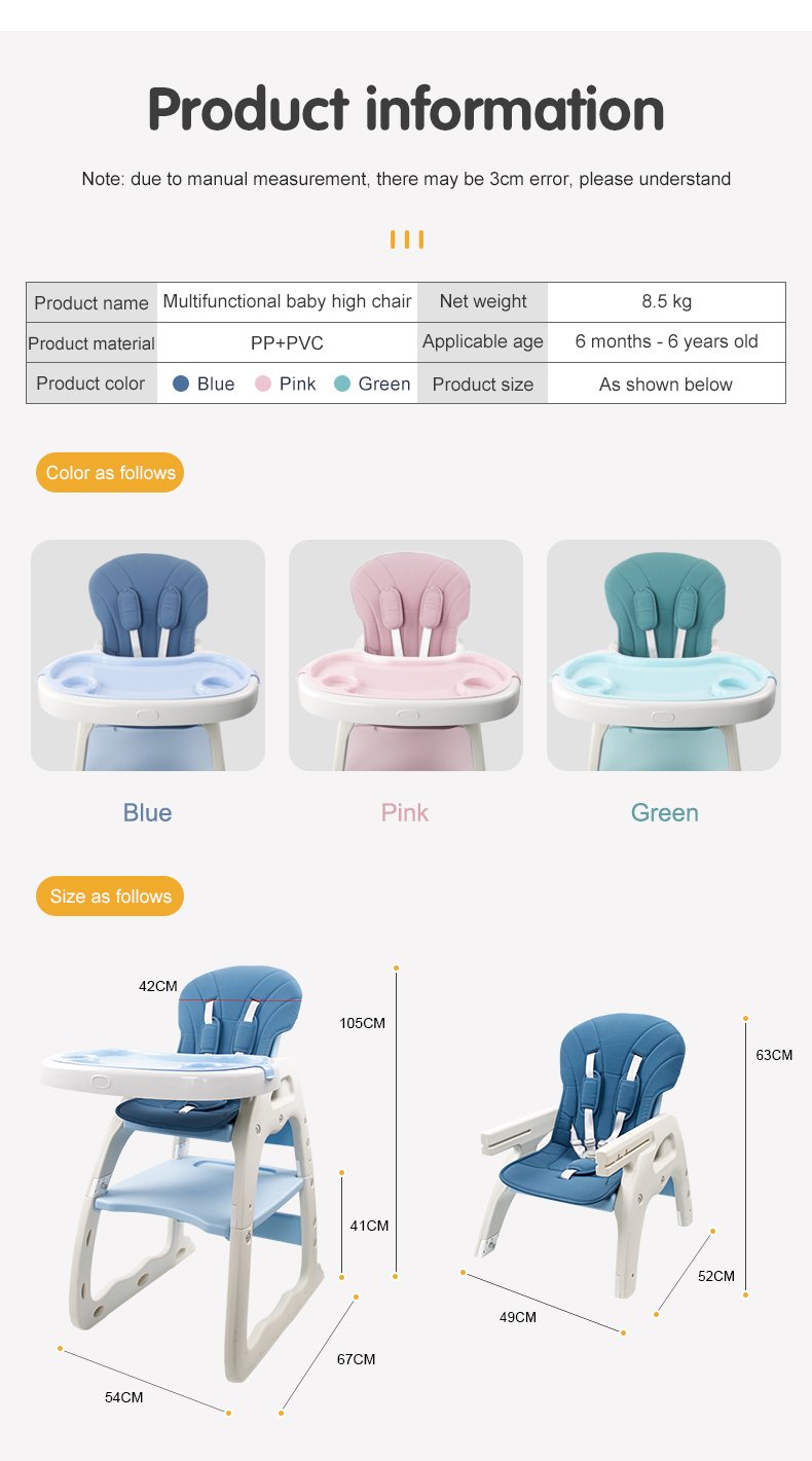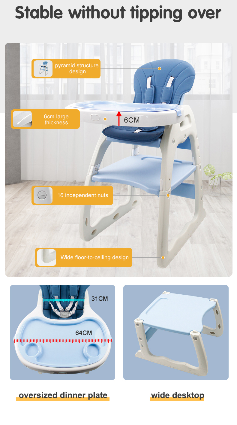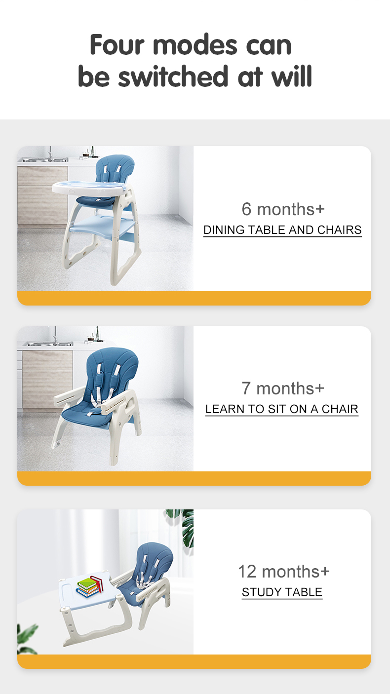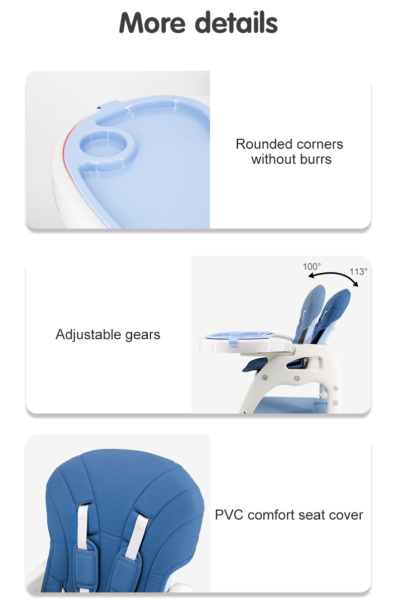 1.Can sit,lie, push, lie2.Dining Chair 8-gear height adjustable3.Five-point safety belt4.Detachable double tray5.Third gear width of the dinner platecan be adjusted6.Seat backrest four gear adjustment7.Breathable PVC leather pad8.With removable rollers