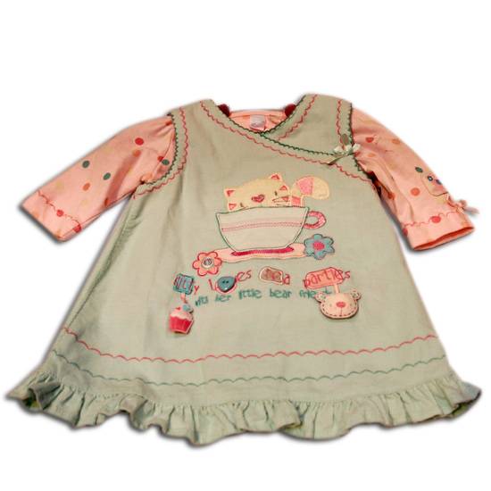 This is a baby's knitted dress set. It consists of a long-sleeve knitted round neck tee with allover printed patterns as well as ribbons on the sleeve cuffs as decoration. The dress is made of fine corduroy and decorated with embroidered applique.
