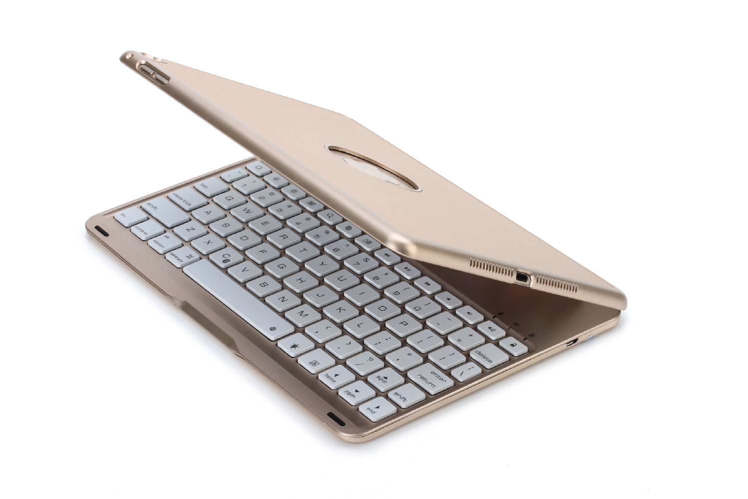 Item Model: F8S+ Product: Wireless Bluetooth Keyboard Applicable Models: Apple iPad Air2 Function: Keyboard + Protective + Suppo rt Product Feature * LED Backlit - Built in led 7 color beautiful b acklit Panels bring you the best visual enjoyment, the brightness and color can be freely adjusted as you like . * Multi-Function Application - Support IOS system and compatible with Android Windows. * Intelligent Switch and Support Smart Sleep Mode- Magnetic Intelligent induction can be switch on/off the keyboard, Automatically enter the sleep mo de once close it. Energy saving and convenience. * Super-Slim and Portable - Using ultra-thin design concept, the thickness of keyboard only 7mm, super light for carry. Yo ur best partner for business or vacation. *Exquisite and Fashion - Bottom is aluminum alloy material and environmental ABS plastic , Clamshell design Perfect protect your iPad. * Magnetic Type of Design - Conjoined design, make your iPad in the best visual Angel meets your different visual needs. * Convenient and Quick - Shortcut key Fn+C can open bluetooth, click bluetooth signal on the iPad for pairing. Get rid of old comp lex pairing, more convenient and quick. * Special Function Keys - Music co ntrol, volume control, home page control, etc. * Ultra-long Standby Time - Standby time almost reach 330 days . * The Surface Patch Material : iron sheet paste to silver product, and PU leather paste to dark grey one. country of origin:China N.W./ pcs:s- 543g ;dg-481g pcs /carton :20pcs working voltage:3.0 v-5.0 v working current:177 mA sleeping current:0.1mA standby time:330 days bluetooth version:broadcom 3.0 lithium battery capacity:800 mAh operate distance:10m key life :5 million stroke color :black, silver, golden