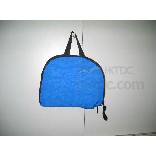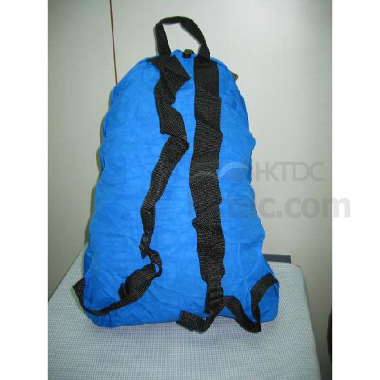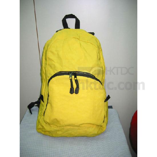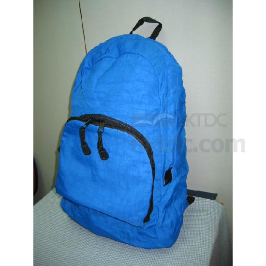 • Foldable backpack with large main compartment, small pocket inside, zippered pocket on front.