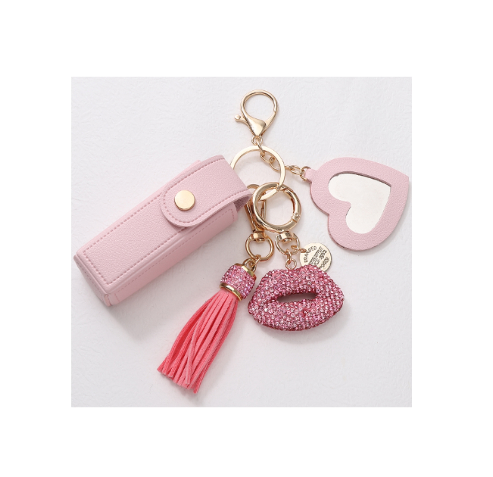This keychain set includes a faux leather lipstick case with a snap closure, a sparkling rhinestone lip charm, a soft suede tassel, and a heart-shaped mirror.