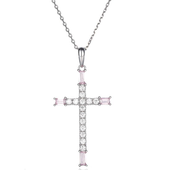 Baguette Pink And Round White Cubic Zircon Rhodium Silver Pendant