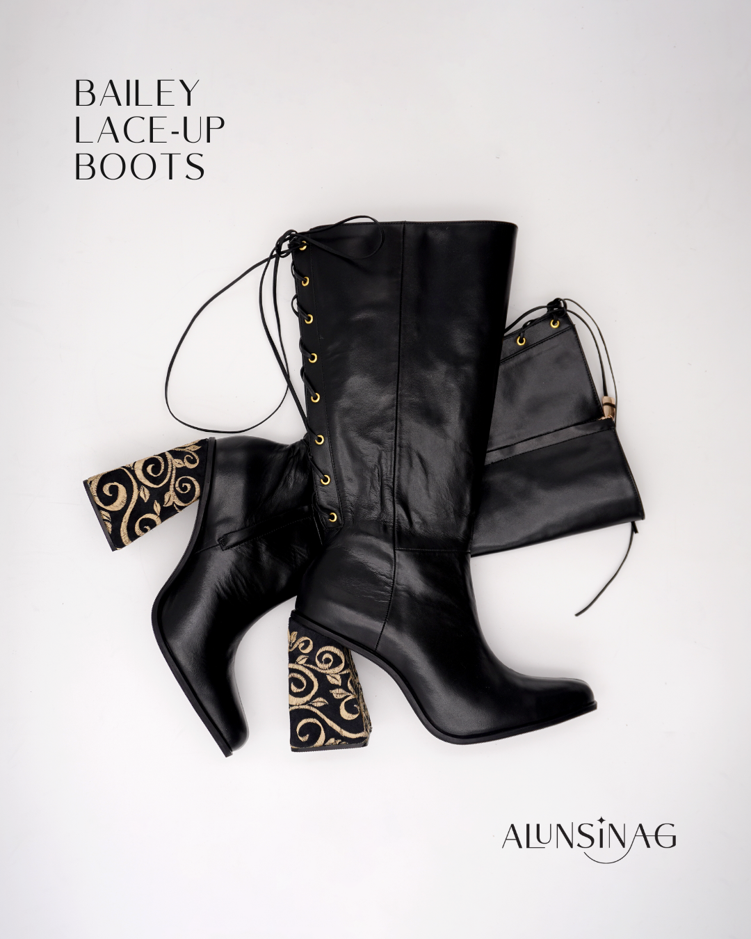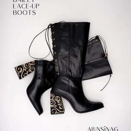 Materials: black genuine leather and black suede with gold silk thread embroidery