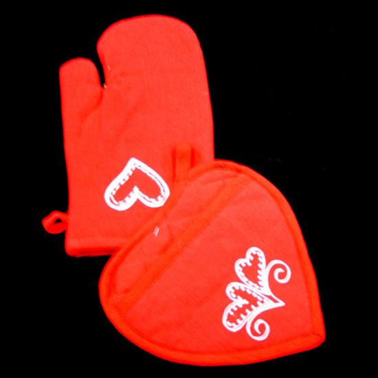 This baking glove set features a sharp red color decorated with a white heart-shaped pattern. Consisting of a thick baking glove and a pot mat, this baking glove set protects your hand and table surfaces from heat. Functional and smart, this baking glove set brightens your cooking experience instantly.