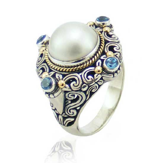 This Bali two-tone ring features a whimsical design with intricate and detailed work. The luminous white mabe pearl crown is sure to grab people’s gaze effortlessly. This chic pearl ring is an ideal gift for your beloved one on special occasions.