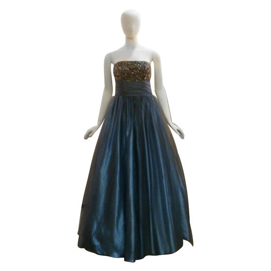 Become the center of attraction in this grand ball gown shaped with extra volume. The strapless bodice glints with shimmering gems against a black background. A gathered A-line silhouette wrapped in blue organza falls below the pleated waistband for an impressive look.