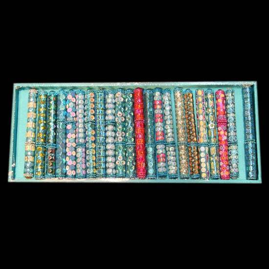 The picture shows a wide range of ball pens with glittering ornaments on the pen bodies and caps. Beads of different colours are used to create flower and other patterns, giving the pens very colourful, vibrant and stylish look.
