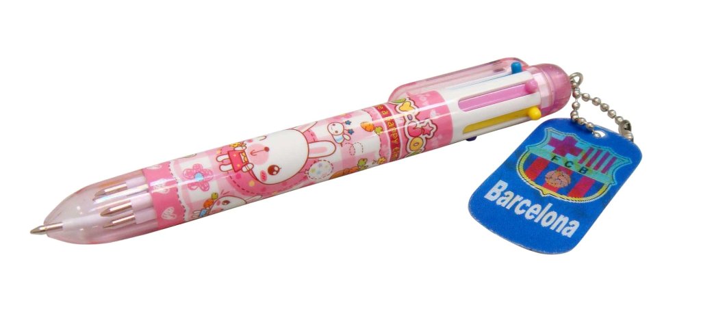 This ball pen offers multi-colored ink and has a wide barrel to offer a comfortable grip. It is adorned with cartoon patterns on the barrel and has a tag on a ball chain attached to the top. The multi-color ball pen is prefect for kids and is good for school use, office use and promotional applications.