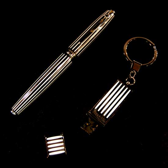 This deluxe ball pen gift set comes with a metal roller ball pen and a USB flash drive. The items feature sleek black and white stripes and a polished, high-shine finish for a touch of sophistication. This ball pen gift set is an impressive gift for business associates and writers.