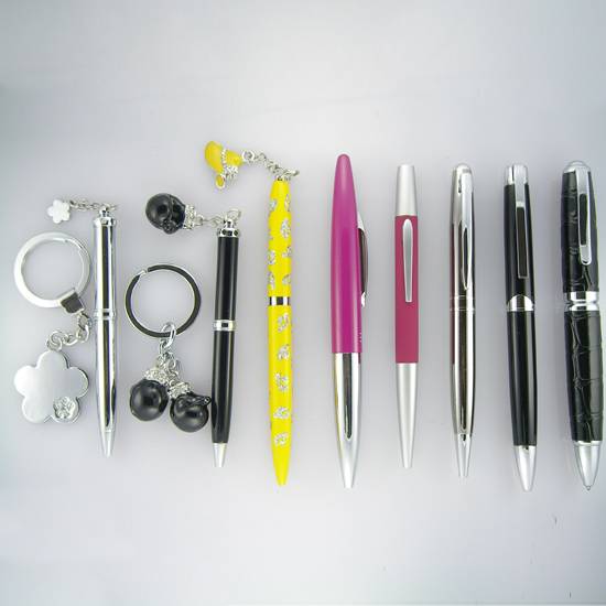 These are ball pens and key chains which are made metals. The ball pens are of twist style and equipped with clips.
