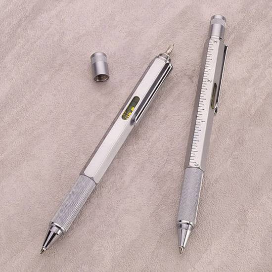 The ball pen with a ruler on the handle. It has a metal pen hook on top. It has a comfortable rubber handle.