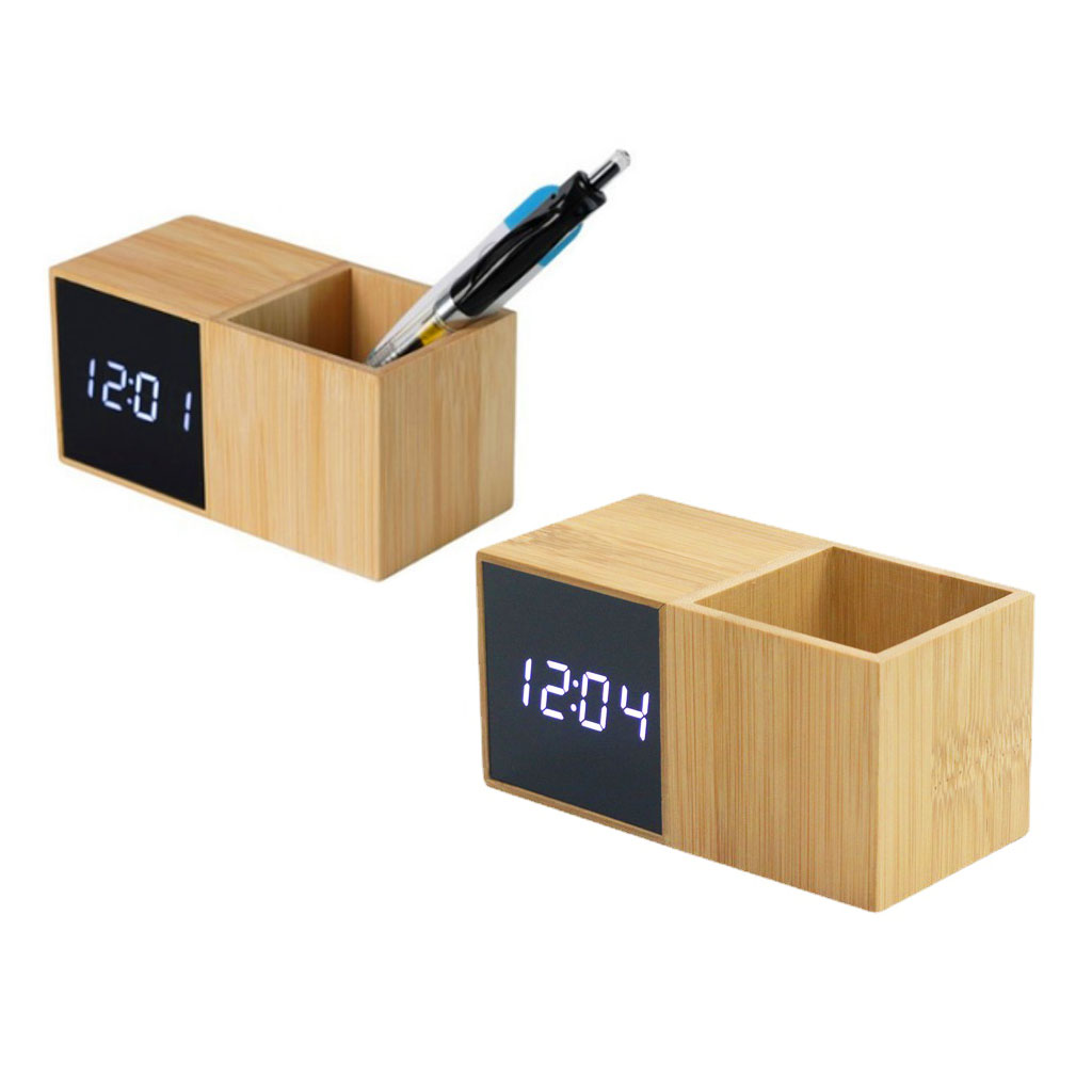 Bamboo Pen Holder with LED Alarm Clock Display includes the following features :