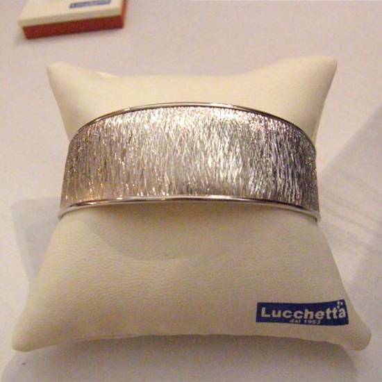 This is a silver bangle with a stamping finish surface. The vertical and diagonal pattern on the wide bangle adds its stylish and elegant feature, making it suitable for wearing in casual and formal occassions.